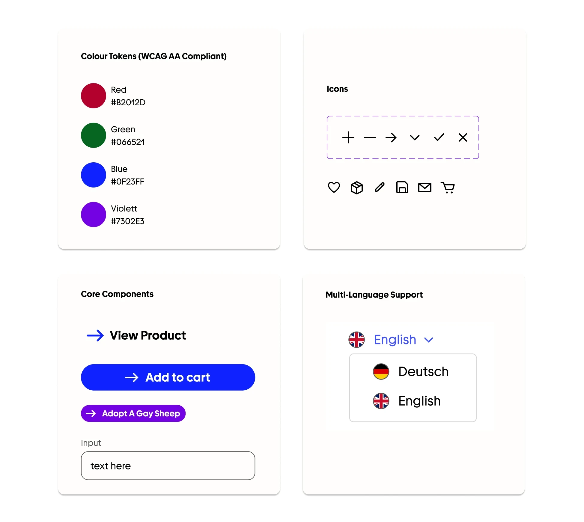 Built from scratch as a single source of truth for design and development. Colour tokens, icons, components and multi-language support as we were launching in the USA too. WCAG AA compliant throughout.