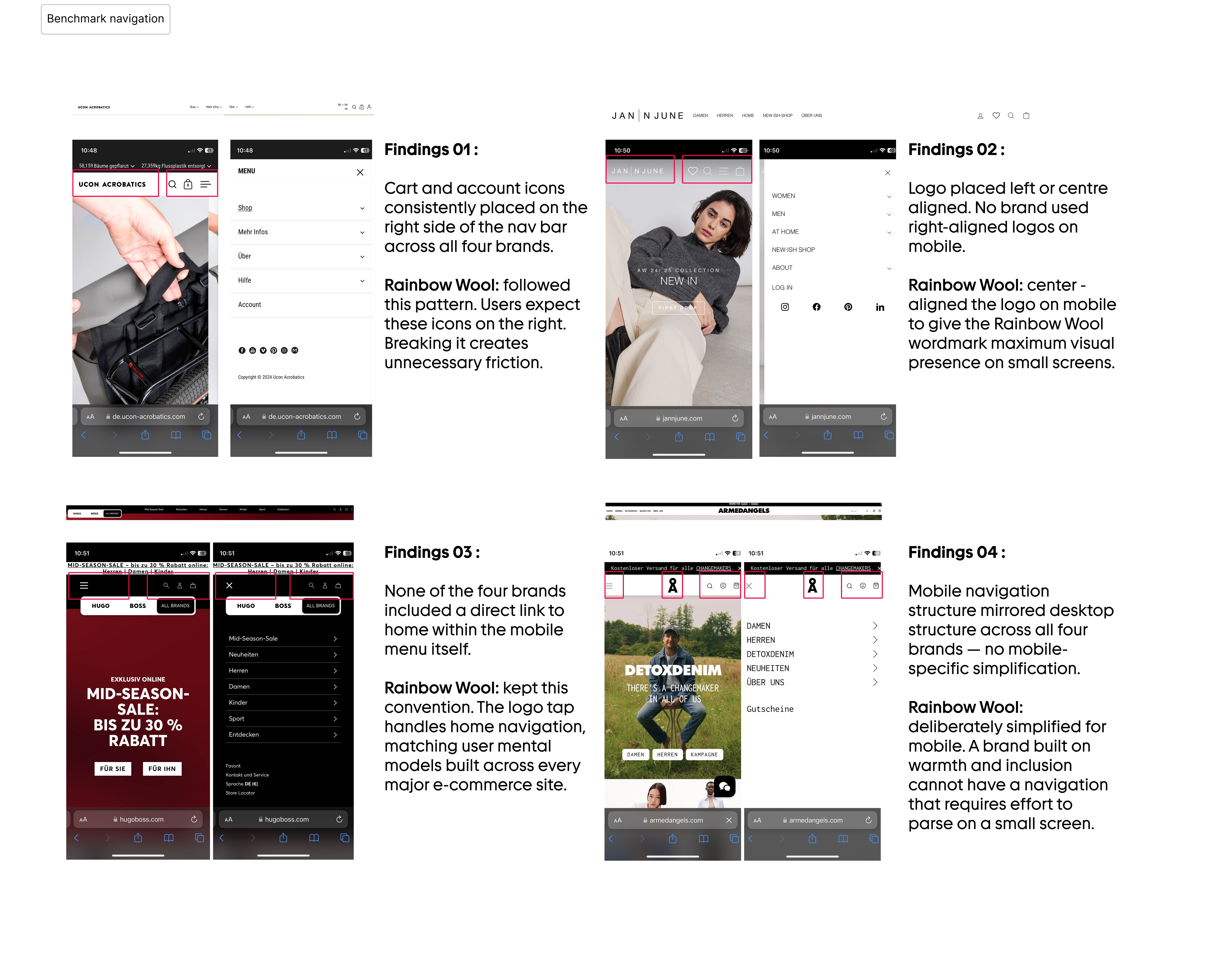 Before designing anything I ran a benchmark analysis across four comparable fashion e-commerce brands: Ucon Acrobatics, Jan N June, Hugo Boss, and Armedangels. I focused specifically on mobile navigation. Being the highest-friction point in any mobile shopping experience and documented four patterns that appeared consistently across all four brands.