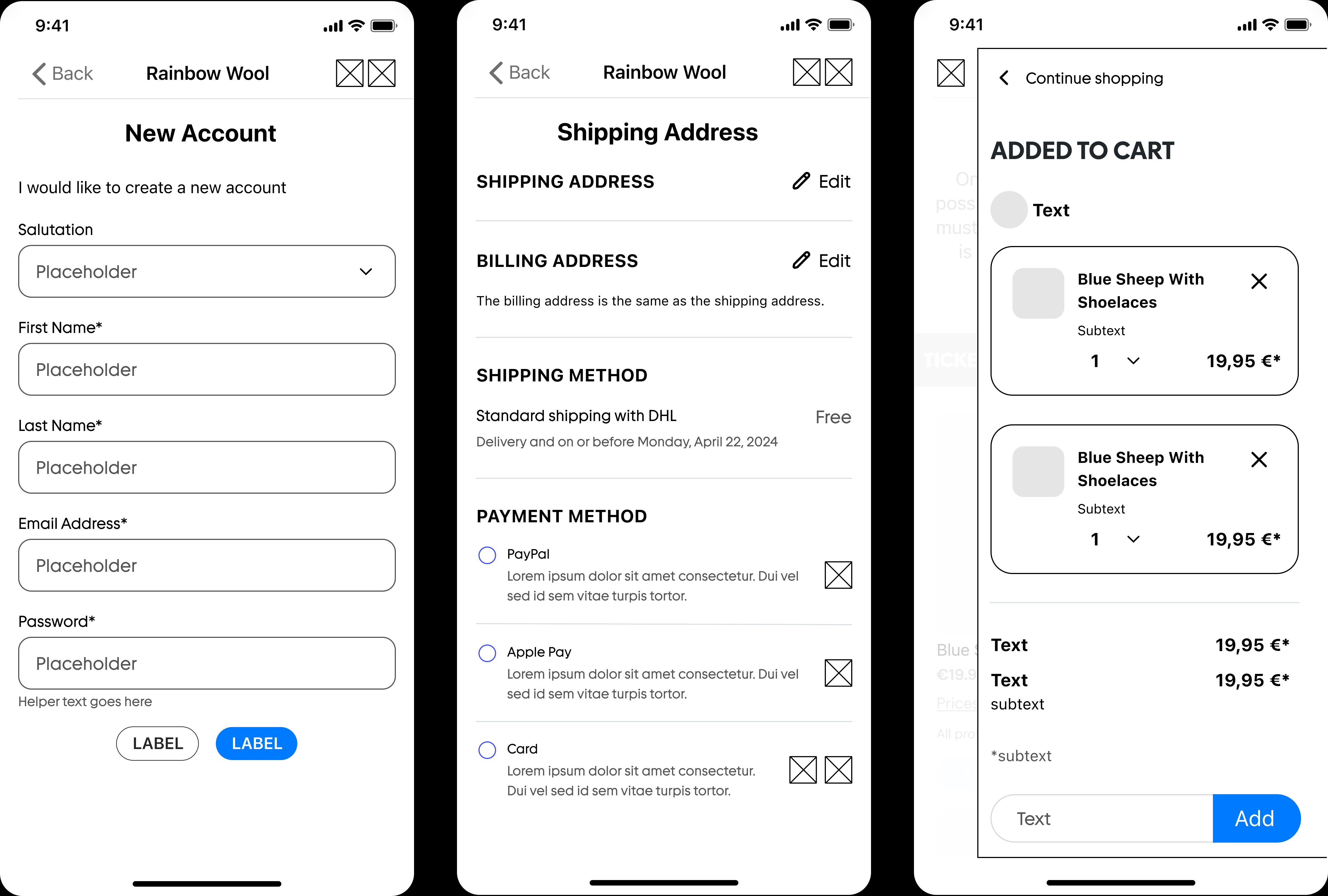 Wireframes came before colour or branding by keeping focus on flow logic and accessibility. Four screens: home, collections, checkout, and order confirmation. The checkout was accessibility tested at wireframe stage.